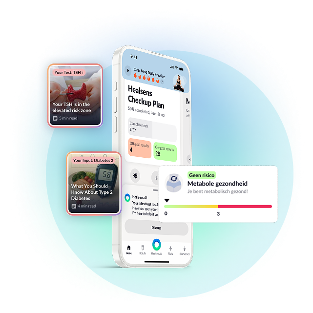 Krijg wetenschappelijk onderbouwd advies — wat je afwijkende testresultaten betekenen — en ontdek subklinische veranderingen die vermoeidheid, stemmingswisselingen of andere klachten kunnen veroorzaken die artsen vaak over het hoofd zien. Je leert hoe je de juiste supplementen kiest, je stemming en mentale gezondheid ondersteunt en stappen zet die veroudering kunnen vertragen. Healsens AI verbindt je resultaten, risico’s en dagelijkse gegevens en vertaalt ze naar duidelijke, bruikbare inzichten waarop je kunt vertrouwen.