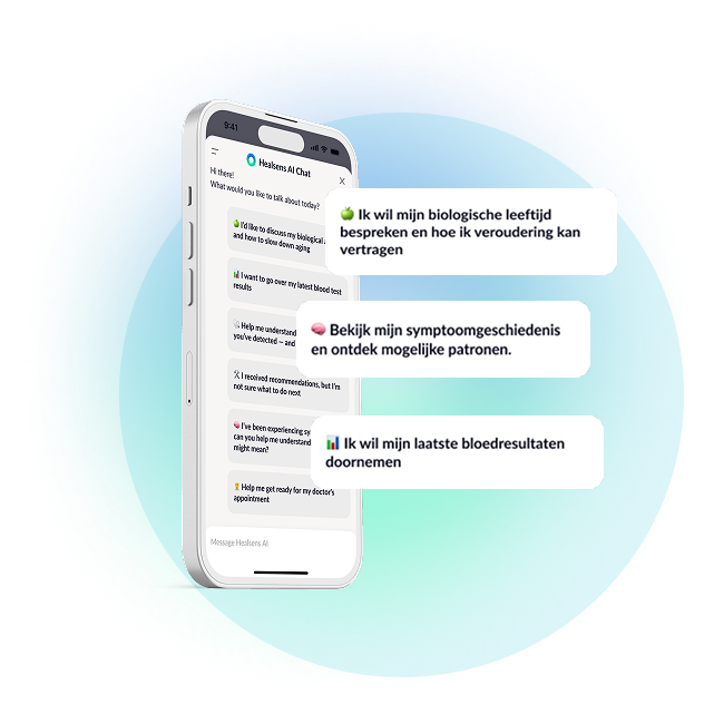 Healsens analyseert je biomarkers, berekent je biologische leeftijd en gezondheidsrisico’s, en biedt AI-gestuurde begeleiding — van testresultaten tot persoonlijk actieplan.